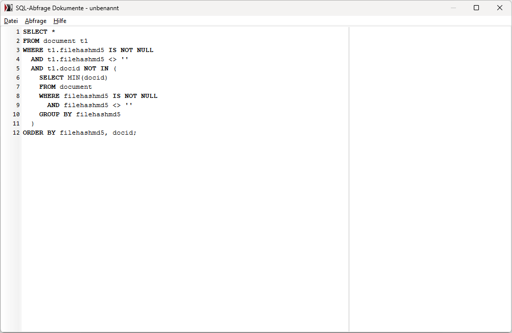 gruppiert alle Dokumente nach ihrem Dateihash und sucht nur das Dokument mit dem kleinsten Schlüsselwert. Die kleinste docid bedeutet, dass dieser Datensatz zuerst erfasst wurde. Datensätze mit leerem Dateihash (also ohne Datei) werden nicht berücksichtigt, das sind beispielsweise Internetadressen und Verknüpfungen zu Verzeichnissen.