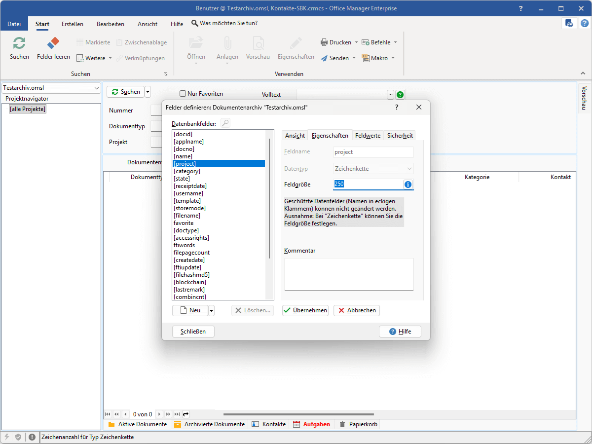 Um die Verlinkung auch in der Pro-Edition nutzen zu können, klicken Sie auf den Mausschaler Neu und geben bei Feldname „doclink“ ein. Der Datentyp ist „Zeichenkette“ mit einer Feldgröße von mindestens 12 Zeichen. Auf der Seite Ansicht als Bezeichnung „Verlinkung“ eingeben und auf Übernehmen klicken.