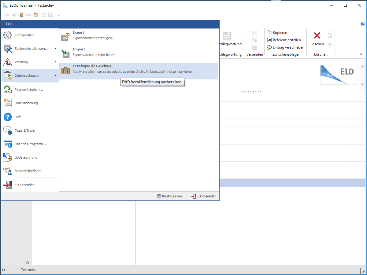 Sie können zwar auch direkt auf die ELO-Archivdatenbank zugreifen, wir empfehlen aber den Import aus einer Kopie. Exportieren Sie dazu das gewünschte Archiv: