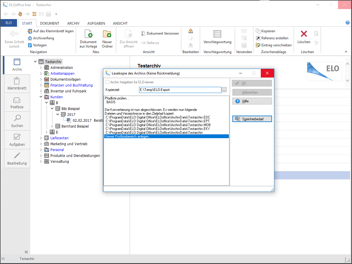 Wählen Sie bei Kopierziel bitte ein Verzeichnis. Auf dieses muss später auch Office Manager DMS zugreifen können. Klicken Sie auf OK und schließen Sie das Fenster, sobald der Export abgeschlossen ist.