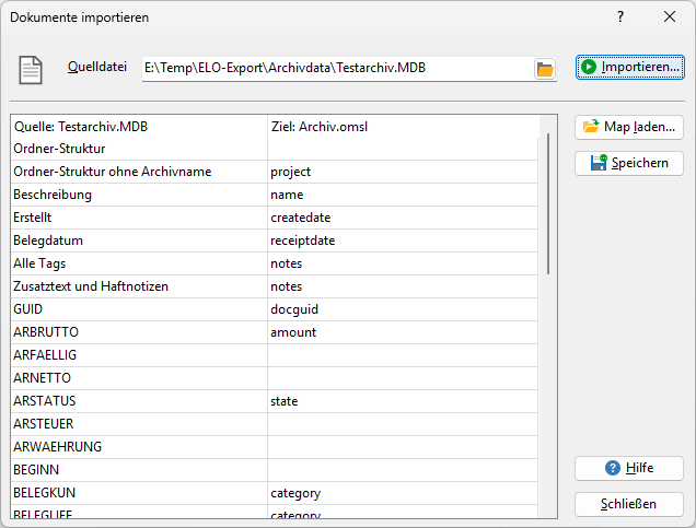 | Beleg- und Ablagedatum | Datenfelder gemäß Zuordnungstabelle |