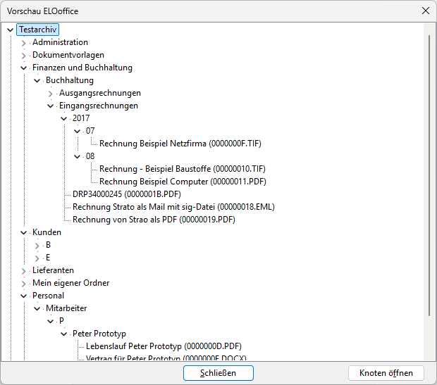 Das Programm durchsucht jetzt das Dokumentenverzeichnis und fragt zu jeder Datei die dazugehörige Verschlagwortung, Versionen und sonstige Informationen aus der Datenbank ab. Dies kann bei großen Archiven einige Zeit in Anspruch nehmen. Anschließend sehen Sie eine kurze Statistik und die Vorschau mit der Datenstruktur: